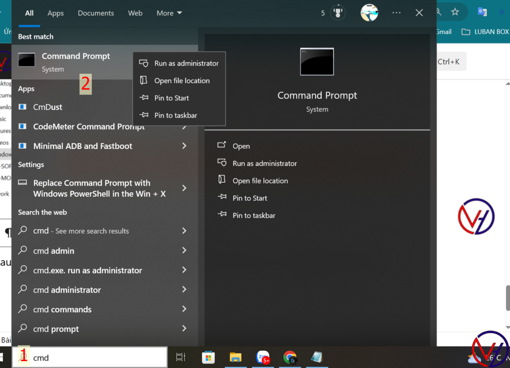 nhấn nút Windows + R , gõ vào CMD , đưa chuột lên phần Command Prompt chuột phải chọn Run as administrator để chạy lệnh bằng quyền admin.