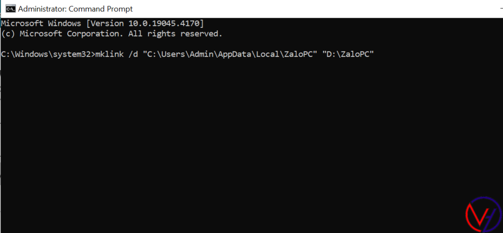 mklink /d “C:\Users\Admin\AppData\Local\ZaloPC” “D:\ZaloPC”