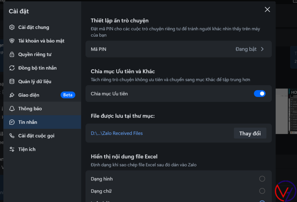 Mở ứng dụng Zalo trên desktop, vào cài đặt \ Tin nhắn\ . ở phần “file được lưu tại thư mục ” Chọn thay đổi và trỏ về thư mục D:\ZaloPC.