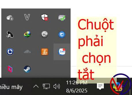 Nhấn chuột phải vào biểu tượng Zalo ở cuối góc phải màn hình, chọn tắt.