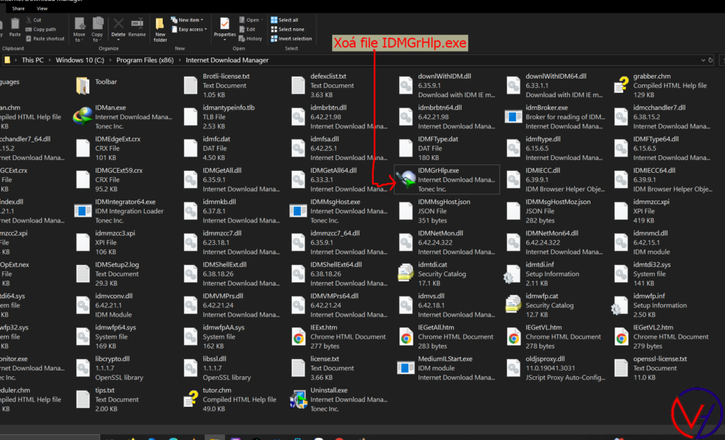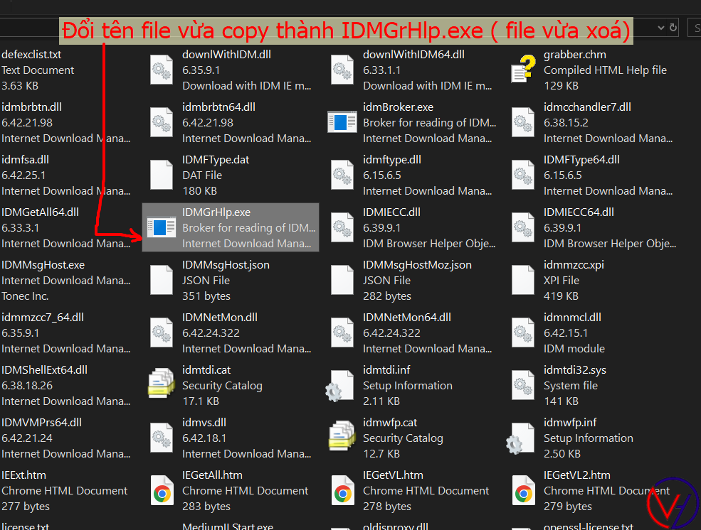 Nhìn sang cửa sổ bên phải, tìm file có tên là “IDMGrHlp.exe” hoặc “IDMGrHlp”, lúc này, các bạn có thể đổi tên file thành bất kỳ tên nào bạn muốn, hoặc đơn giản nhất, là xóa nó đi (tốt nhất là nên xóa đi cho tiện).