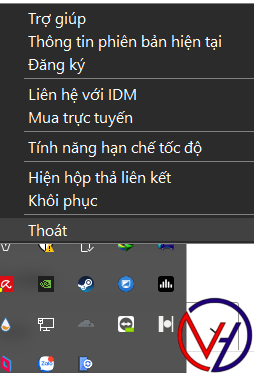 Đầu tiên, các bạn cần phải tắt hẳn Internet Download Manager đi, bằng cách, click chuột phải vào icon IDM ở thanh taskbar, sau đó chọn vào Exit.